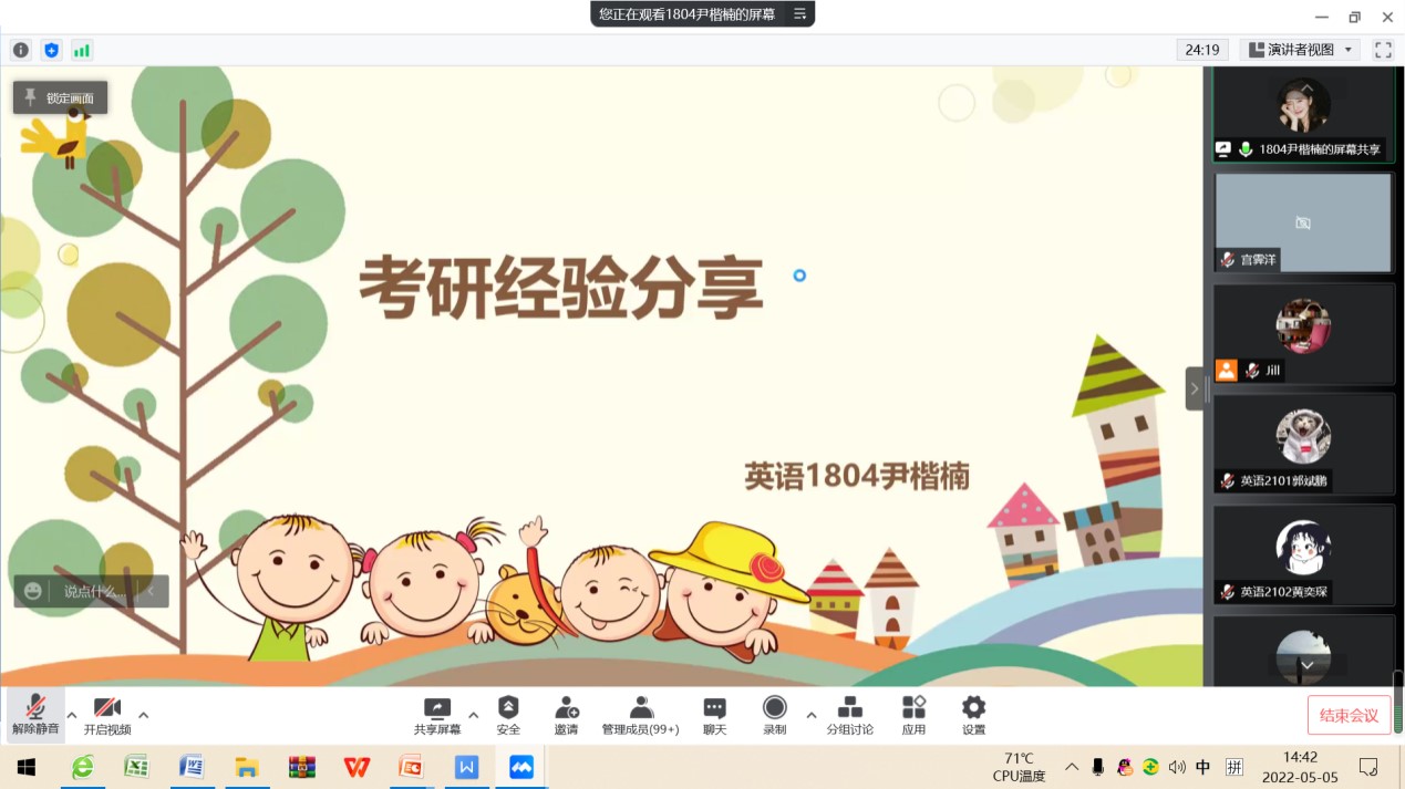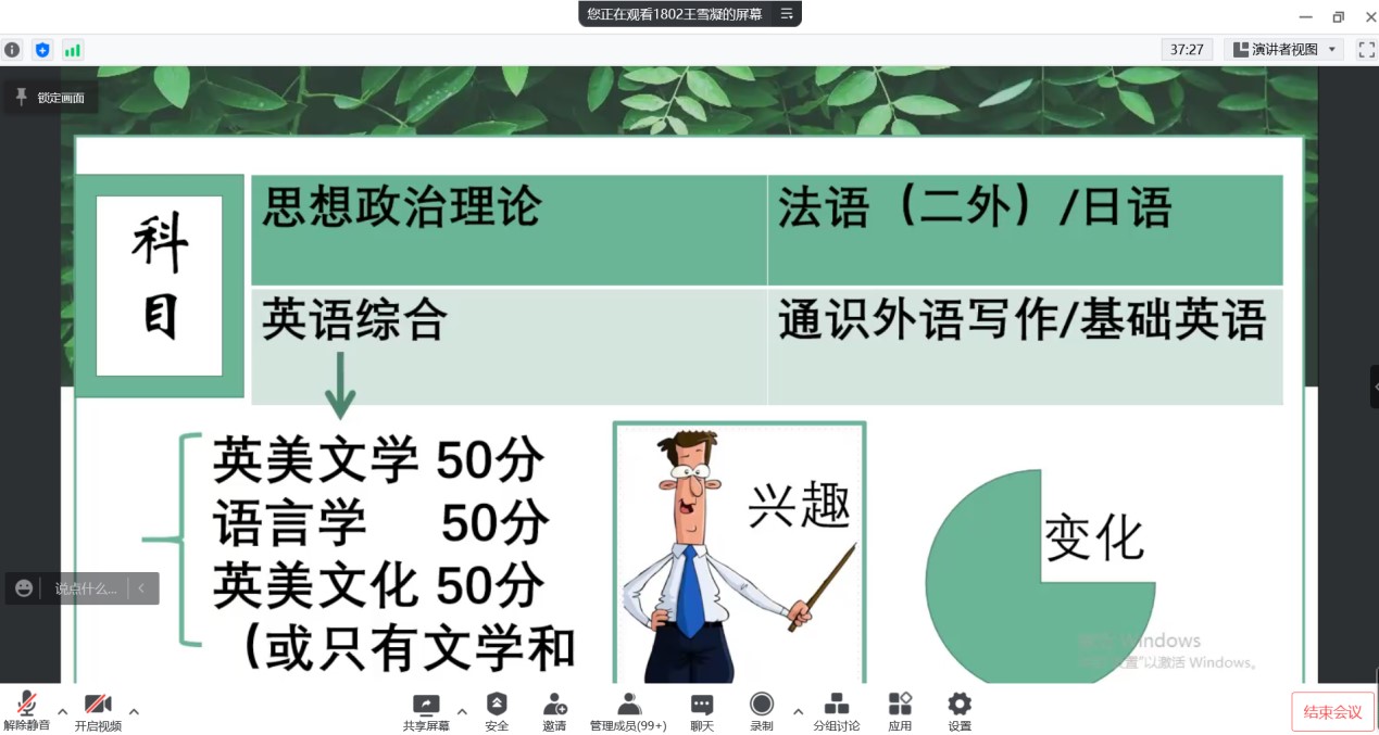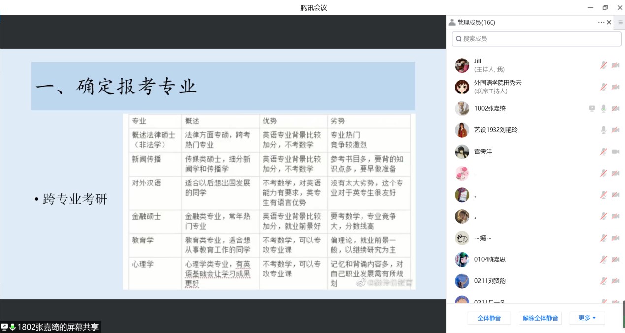 2022年5月5日下午,suncitygroup太阳新城英语专业通过腾讯会议召开了考研暨就业交流会。会议由教学部主任王静老师主持,邀请2018级9位成功考取硕士研究生以及顺利就业的员工交流心得和分享经验,2019级、2020级以及2021级170余名员工与会交流。学长从选择考研学校和专业、复习备考、调剂学校、就业和备考教资五个方面分享了自己的经验,并鼓励学弟学妹们平时注重知识积累和能力培养。