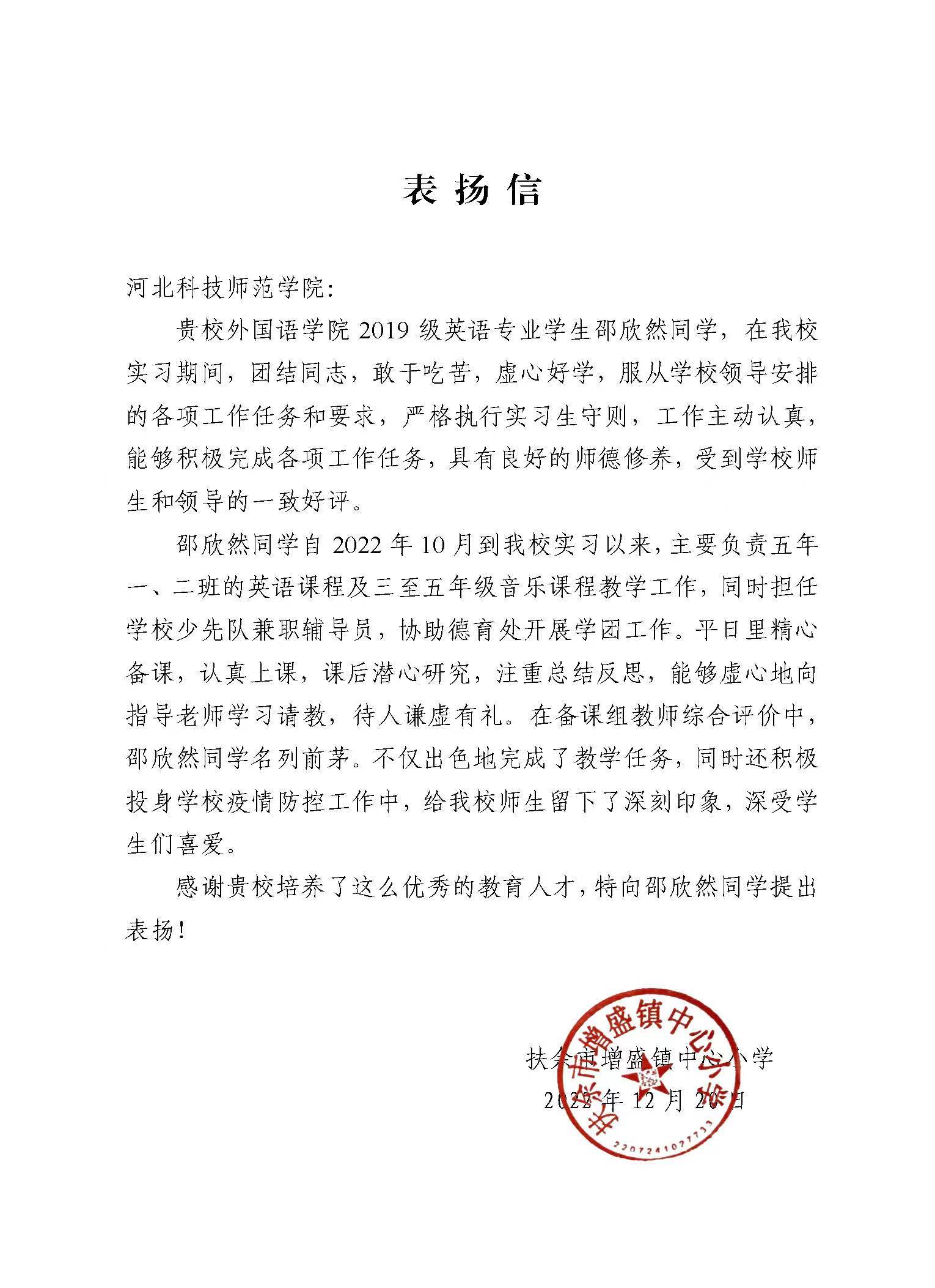 近日,吉林省扶余市增盛镇中心小学向公司发来表扬信,感谢公司英语专业邵欣然同学在该校出色地完成顶岗实习任务。