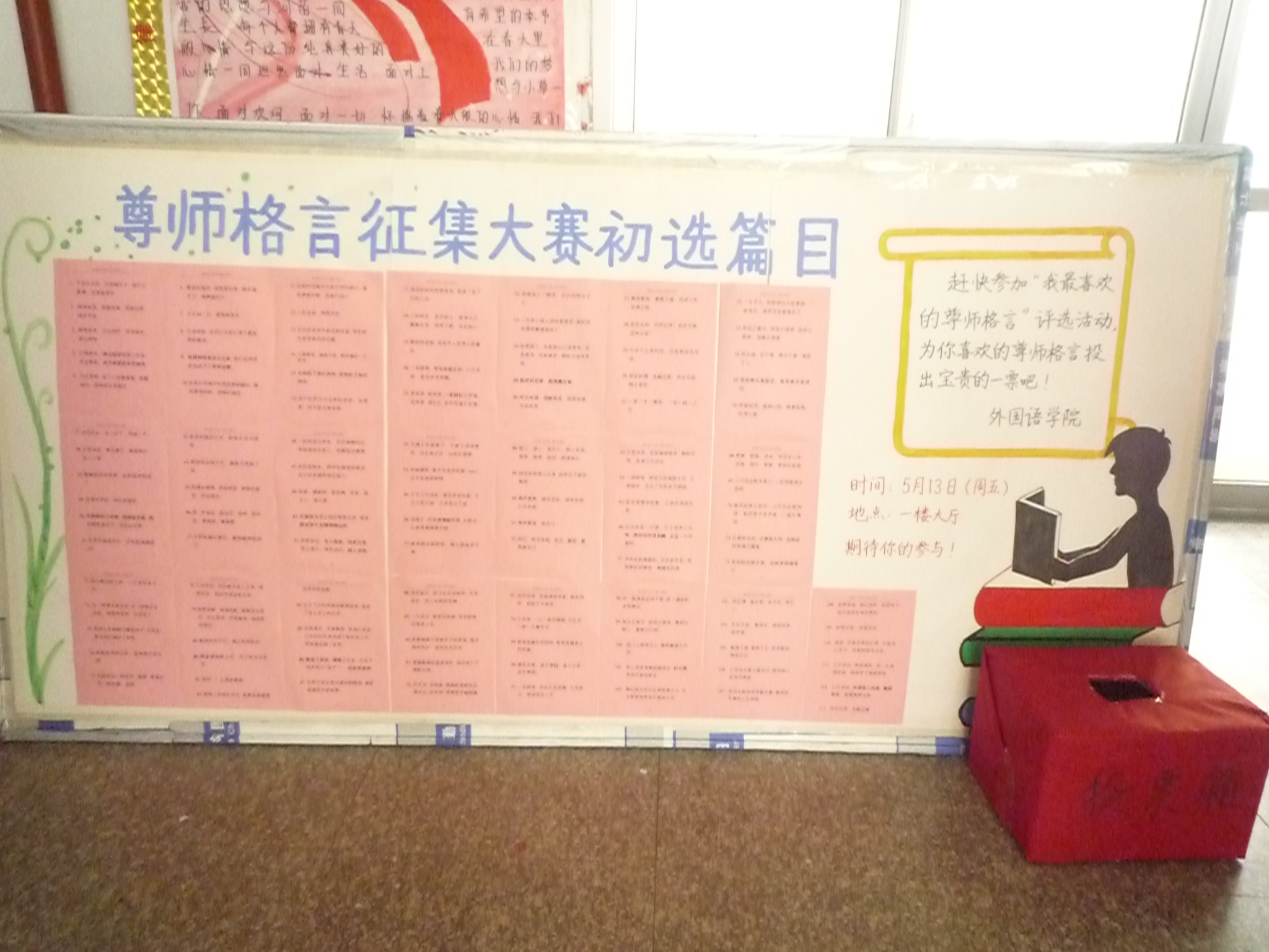 活动受到了学院广老员工的热情欢迎,同学们通过健康、积极向上的原创格言充分表达了对恩师的敬爱之心和感激之情。本次活动共征集到尊师格言500余条,其中通过初选的100多个优秀篇目以展板的形式在主教学楼走廊展出,并号召全校同学积极参与投票,选出自己最喜欢的尊师格言,最终评选出优秀格言一、二、三等奖16名,优秀奖10名,最佳组织奖2名。