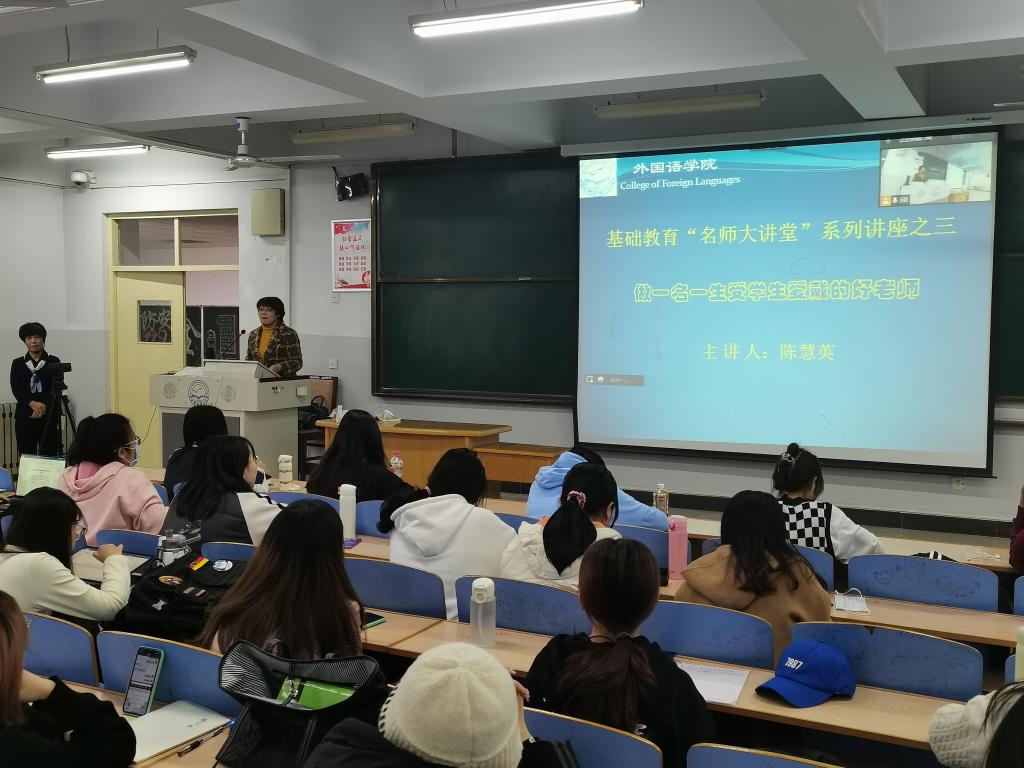 2021年11月18日下午,suncitygroup太阳新城在综合楼312召开了英语专业2020级教育见习师德与教师角色专题讲座,此次讲座是公司“名师大讲堂”的系列讲座之三。特邀主讲人为秦皇岛市海港区教体局高级教师陈慧英老师,陈老师是英语专业2020级的校外导师,河北省中小学省级培训专家团队成员、秦皇岛市首批学科带头人。