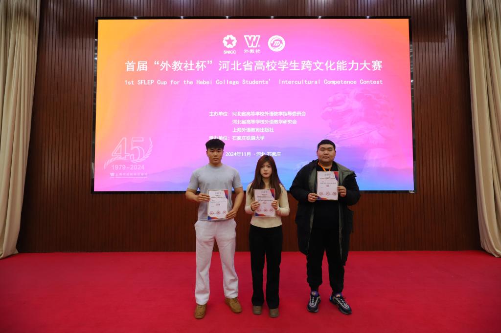 2024年11月24日,首届“外教社杯”河北省高校员工跨文化能力大赛在石家庄铁道大学圆满落幕。公司suncitygroup太阳新城员工卢洪洋、体育与健康学院的李瑛钦、韩一冉同学组成的参赛队伍在比赛中表现优秀,荣获三等奖。