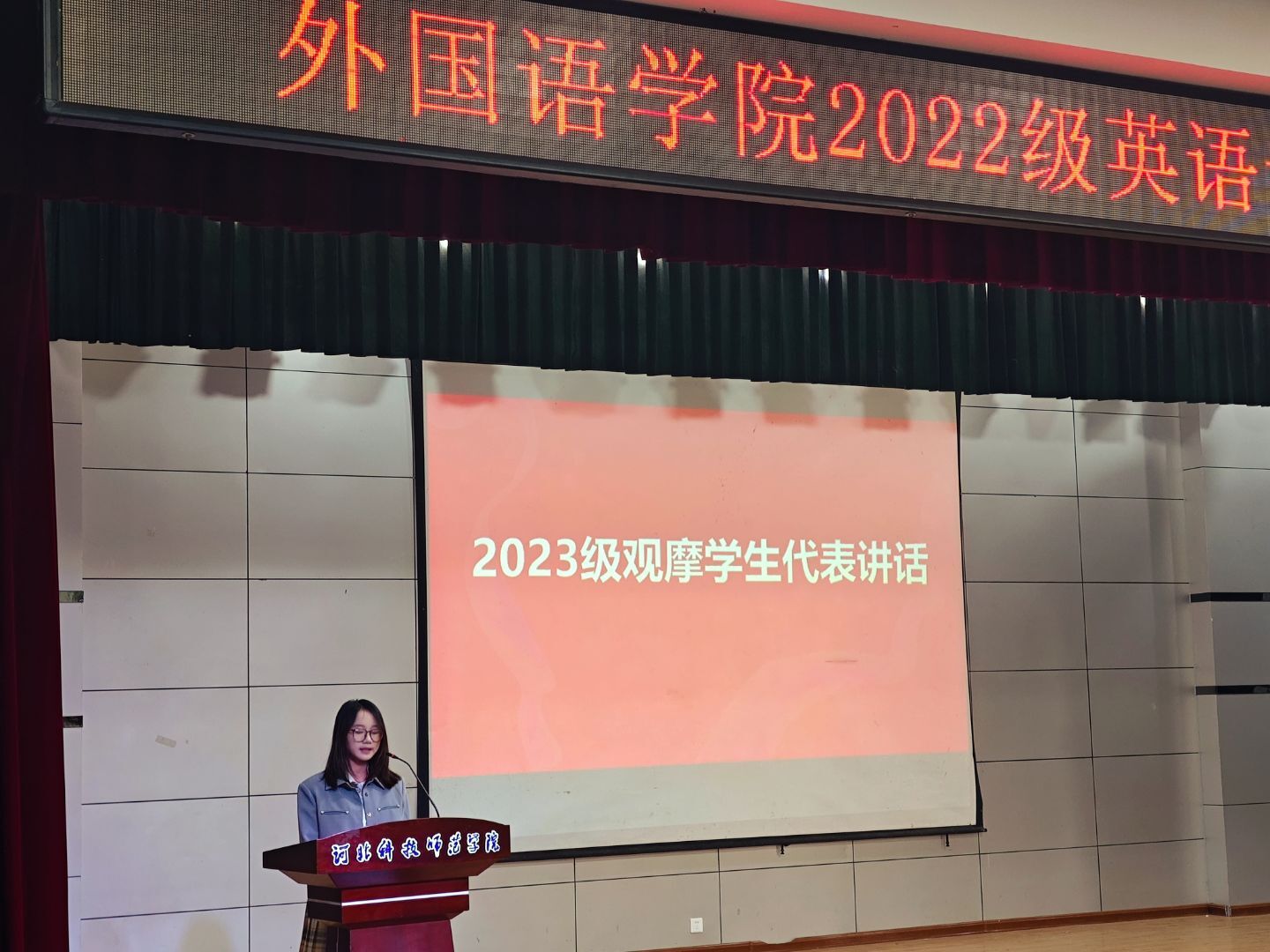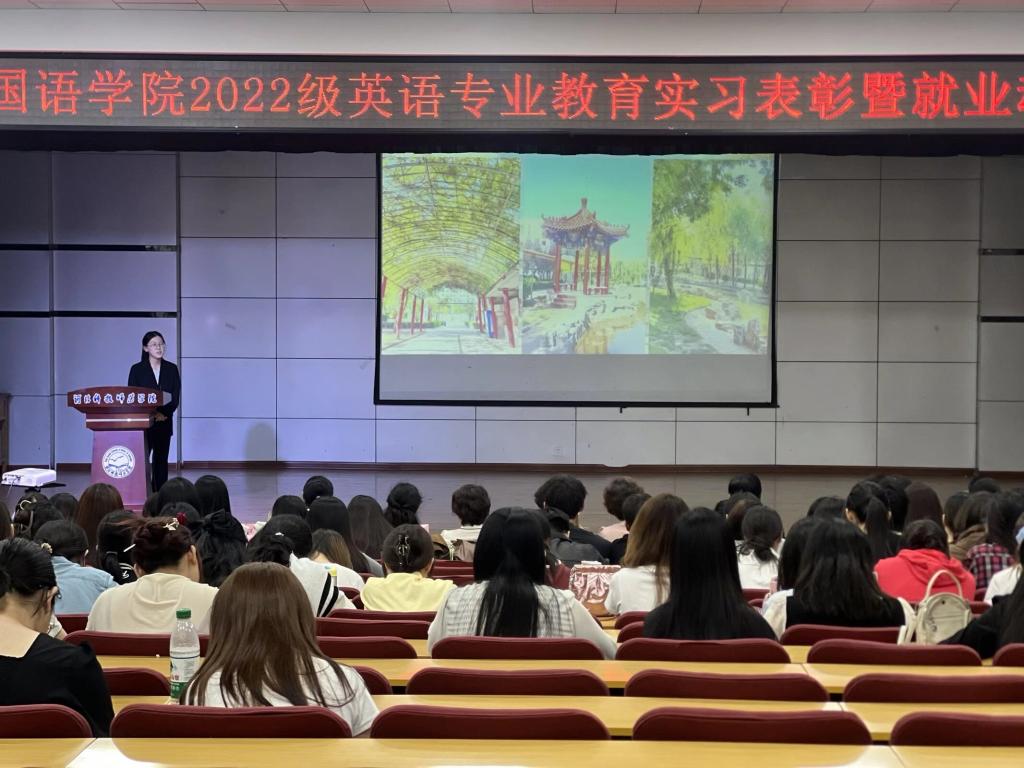 随后,在邢台市临西县老官寨中学实习的周雨轩、刘培同学,衡水市第十四中学的刘雪婷同学,作为实习基地的优秀代表进行了汇报。她们结合实习经历,分享了在教学实践中的感悟与收获,情感真挚,展现了外院学子扎实的专业素养和浓厚的教育情怀。