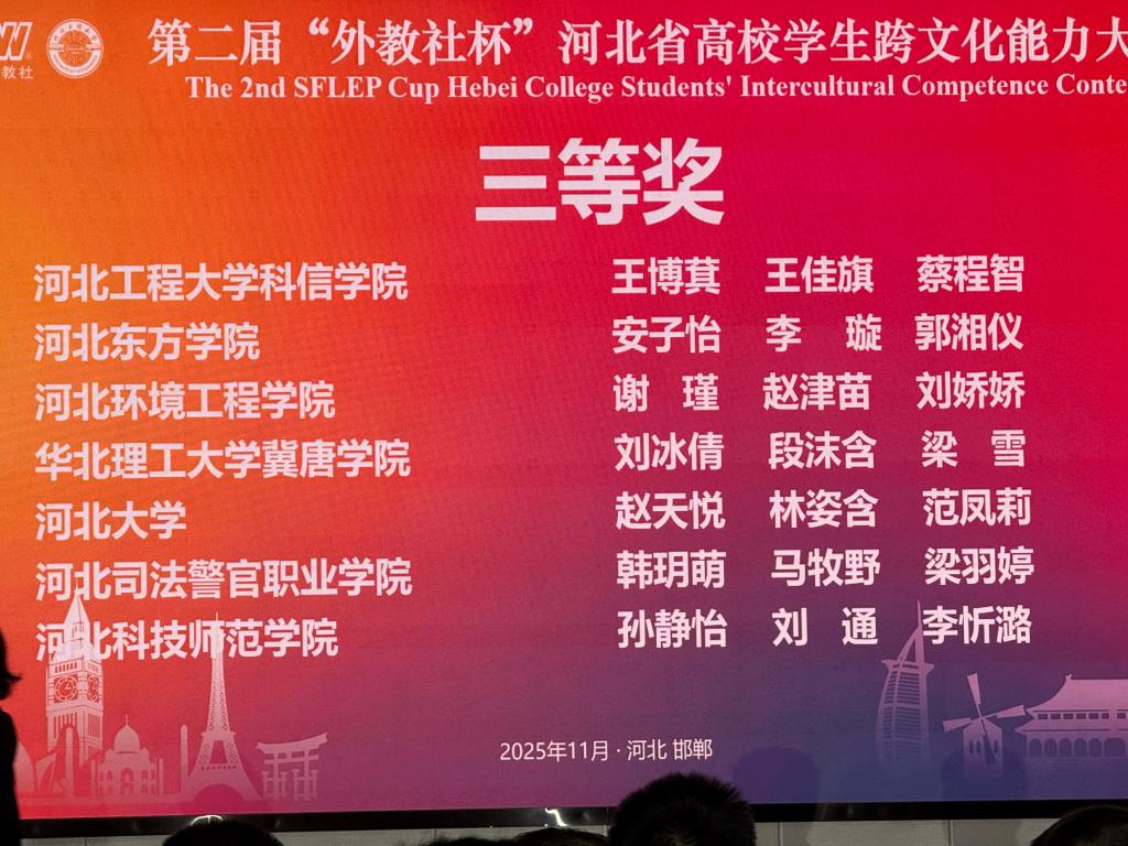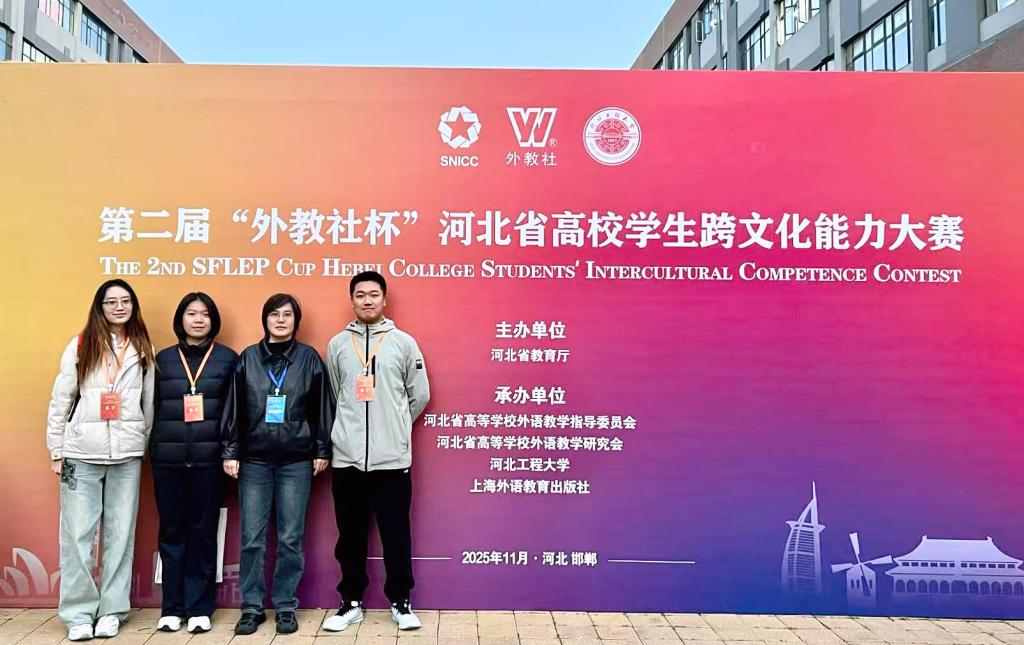 2025年11月14-16日,河北省高等学校“外教社杯”跨文化能力大赛在河北工程大学如期举行。这场覆盖全省多所高校、汇聚外语精英与跨文化人才的巅峰对决,以其高规格赛事标准、高强度竞技节奏,成为检验高校外语教学实力、学子综合素养与跨文化交流能力的核心舞台。在赛场上,公司参赛学子沉着应战、从容不迫,凭借过硬的专业功底、默契的团队协作与卓越的临场应变,以及跨文化大赛专属的国际视野展现、跨文明对话技巧的多重竞技维度中脱颖而出,充分彰显了扎实的语言功底与开阔的全球视野。