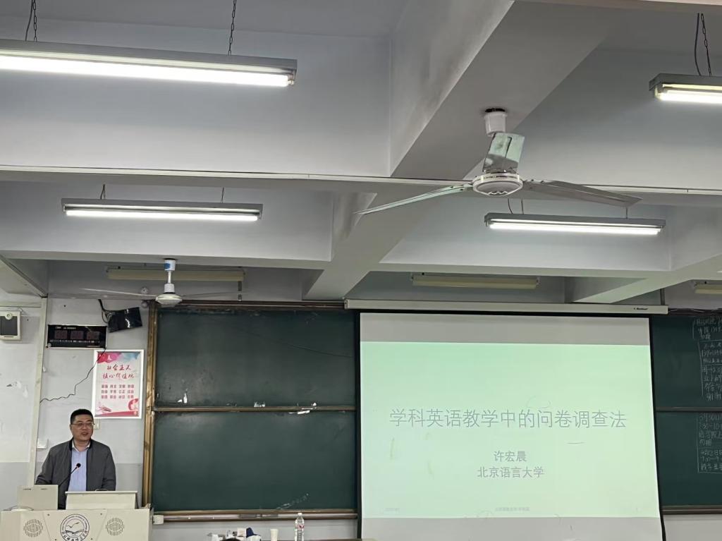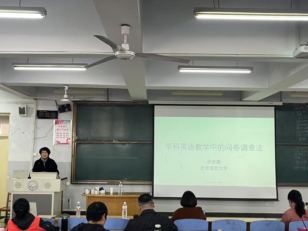 讲座伊始,崔海英经理向与会师生介绍了主讲人许教授的学术背景。许教授现任北京语言大学英语和高级翻译学院教授,其研究领域涵盖教育语言学及应用语言学量化研究方法。在专题讲授环节,许教授系统阐述了学科英语教学研究方法的整体框架,重点围绕问卷调查法展开讲解。主要内容包括:学科英语教学研究方法概览、问卷设计的三个维度、常用问卷题型设计、问卷题项常见错误分析以及问卷数据处理方法等。最后的互动环节中,与会教师积极提问。针对教师们提出的“如何规避问卷中的社会期待效应”、“同一问卷中能否混合使用选择题和李克特量表”等问题,许教授均给予了专业细致的解答。